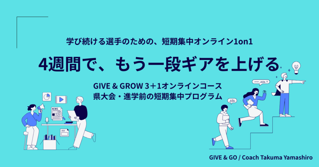 動画1本で、次の練習が変わる。GIVE & GROWは、Zoomではなく「動画+音声/テキスト」で伴走するオンライン指導です。試合・練習・自主練の動画(合計2〜5分目安)を送るだけ。あなた専用の改善ポイントと“宿題ドリル”を返します。 迷ったら、ま...